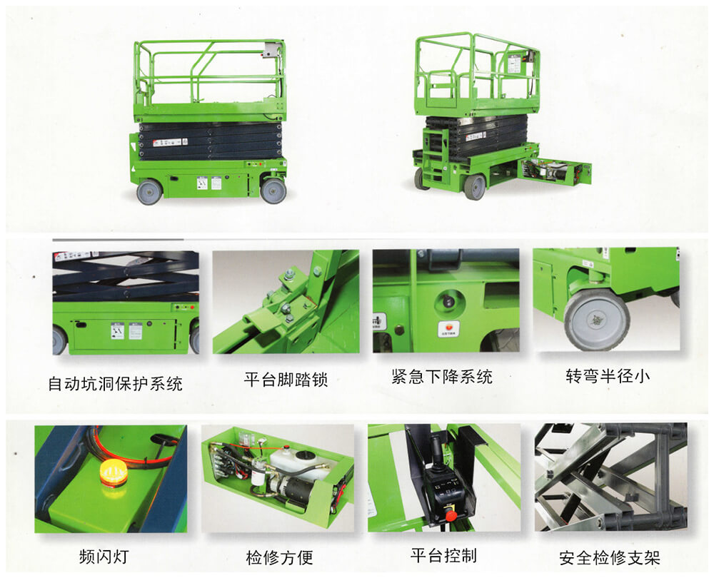 全自走剪叉高空作业平台采用电池驱动,噪音小。配有自动坑洞保护系统。平台可单向延伸,可以迅速达到作业点。故障代码自动显示方便检修。行走、转向为全自动,可在台面控制行走及转向。 操作具自动性。产品特点:结实,可靠,易于维修,标准配件,无痕迹轮胎,斜坡警报,双轮行驶速度,可转弯装置,充电指示器,紧急下降系统。